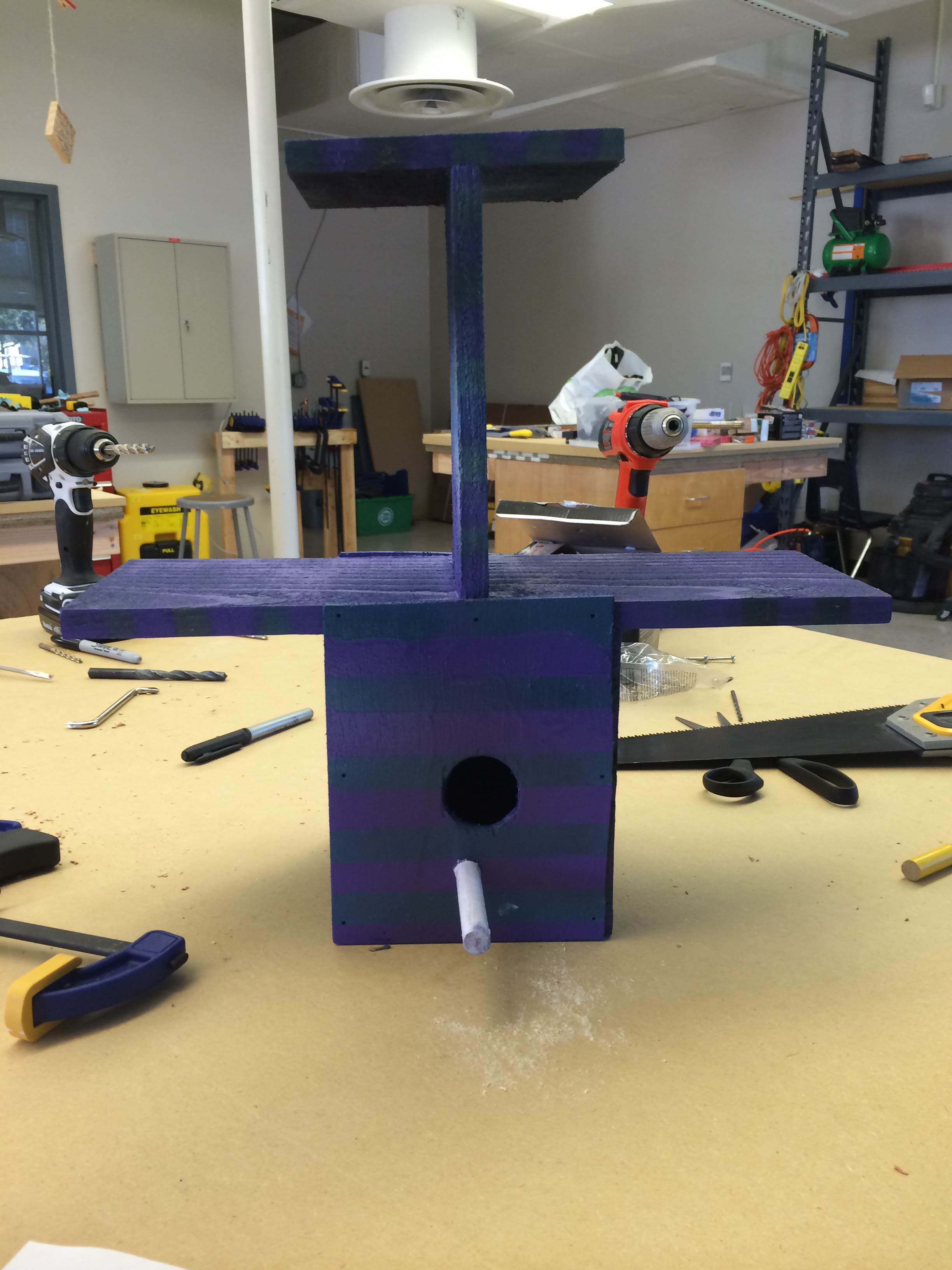 Now the birdhouse. This was definitely an interesting experience. We had moments where we were all like, “OMG I can’t believe we were able to do this!” Or we would have those, “ We’re never going to finish, this is a disaster!!” I felt the most frustration during the process of using the tools or when things didn’t go exactly how it was planned. For example after we had finished building the birdhouse we had to spray paint it and I was really excited because I love art and the idea of painting was exciting. I just didn’t know that spray painting a birdhouse was not going to be so easy. I had a lot of ideas of what I wanted the birdhouse to look like and I think that complicated things. I knew that I wanted some sort of design so we tried to do a leafy design but lets just say it didn’t go well… On the bright side we ending up making a design using tape! As you can see we ended up having a striped pattern. Or one time we lost the dowel to the birdhouse which led us to creating another one in a matter of minutes, only to find the dowel inside the birdhouse and hour later. But there definitely good parts like getting to nail the wood together with a new machine or just seeing our progress in general and how far we’d come. Overall we managed to finish strong. With all of our nerves, confidence and sudden bravery we pulled through all the “scary” tools and our birdhouse in my opinion looks amazing.