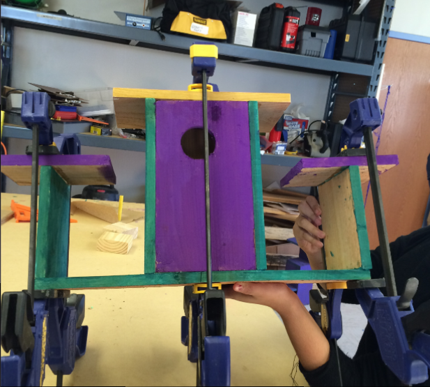 for that to go in. I was also very stressed on putting the hex nut on. The nut wasn’t really the right size for the bolt, so I had to forcefully tighten it down, which took me a long time because I had to figure how to tighten it. After we each made one sandwich, we had to create a right angle birdhouse which would benefit the lives of Native Texas birds. I honestly loved making the birdhouse because 1) I learned how to build a birdhouse, and 2) I was able to actually use power tools which is very cool.