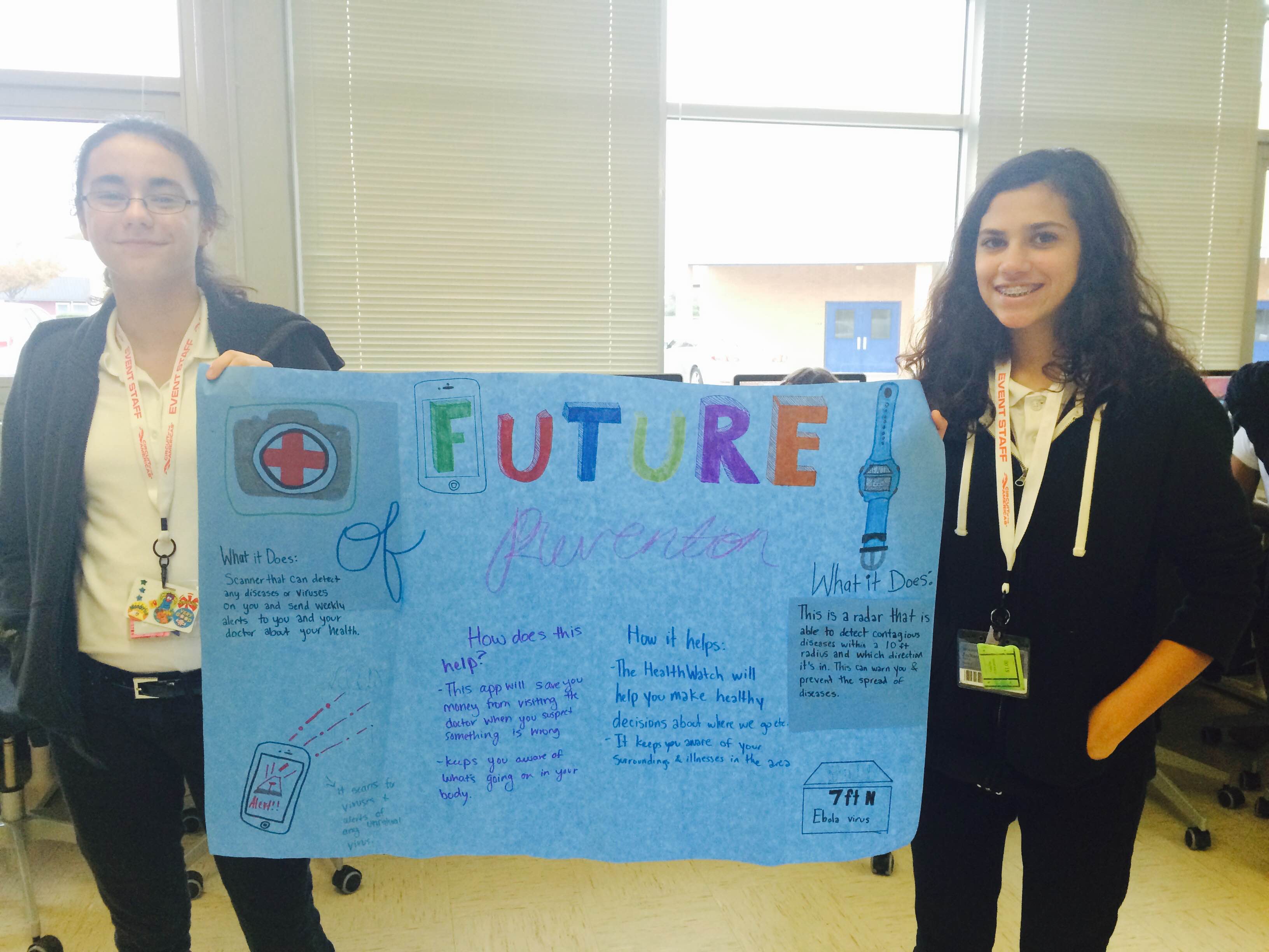 In the biomed module, we made a poster of what we think the future of prevention will look like many years from now. We thought of two ideas: an app and a watch. The app takes pictures and scans you to check for any viruses, infections, that might be where the camera is pointing. For instance, if you feel something wrong with your arm, you could scan it with the app and it will tell you if anything is wrong with it and will suggest the best possible approach to the situation. This can help people not make unnecessary doctors visits and keep you aware of what’s going on in your body. The watch would tell you what diseases are in the area to help prevent the spread of contagious diseases. The “HealthWatch” can help you make healthy decisions about where you go and keeps you aware of your surroundings. These ideas may seem nearly impossible today, but with the right technology, we might be able to make these work.