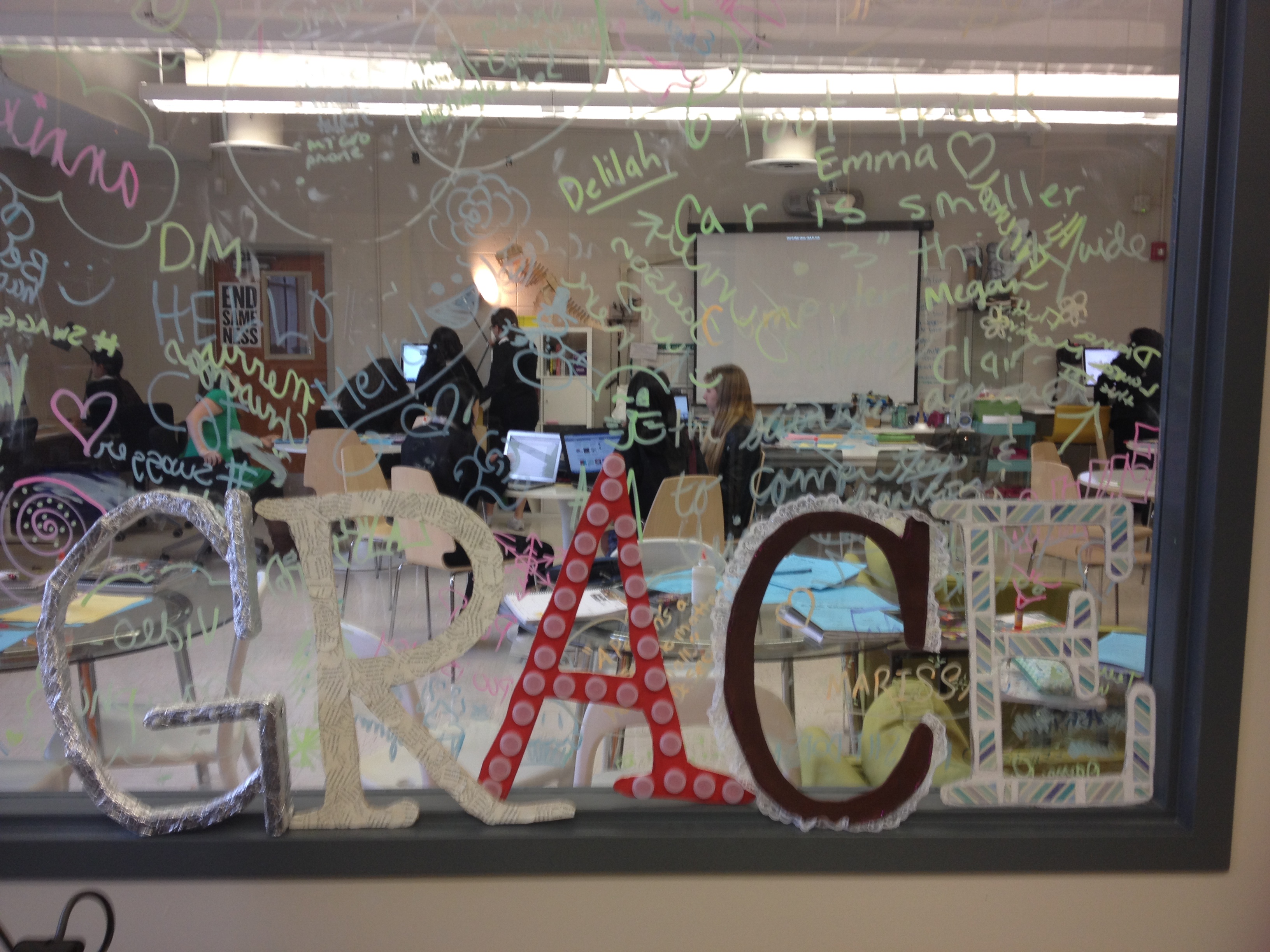 Hello, Karla Rodriguez here. For my blog post today I’m going to describe my experience working on the Materials module, or to be more exact, Challenge 2 of that module. Challenge 2 is called Constructed Signage and for this challenge me and my group (Lendy C. and Vanessa M.) had to make a word out of up-cycled materials. (For those who don’t know Up-Cycling means to reuse discarded objects or material in such a way as to create a product of a higher quality or value than the original.) Specifically a character trait of our school Ann Richards. We thought for a long time and came up with the word graceful but since it was too long a word we shortened it to grace.