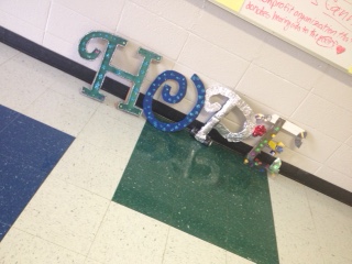 In PLTW right now we are making these sixteen inch letters. In my group we are creating the word Hope. So I got assigned the letter H. H was a very hard word because I wanted to think outside the box like my friend Savannah did. So I had a hard time thinking of something to do with my letter so I had a conversation with Mrs. Sauter and Mr. Oren. They both encouraged me to make my letter three dimensional. I had painted my letter a turquoise and I also used a hot glue gun. I decorated my letter with silver and sparkly pipe cleaners, I put the pipe cleaners as a border for my letter since I didn’t want to show the sharpie that the letter was traced with. Then I got some glitter and these two butterflies to decorate on my letter. My friend let me borrow her jewels to also decorate the letter. This is how my letter came out.