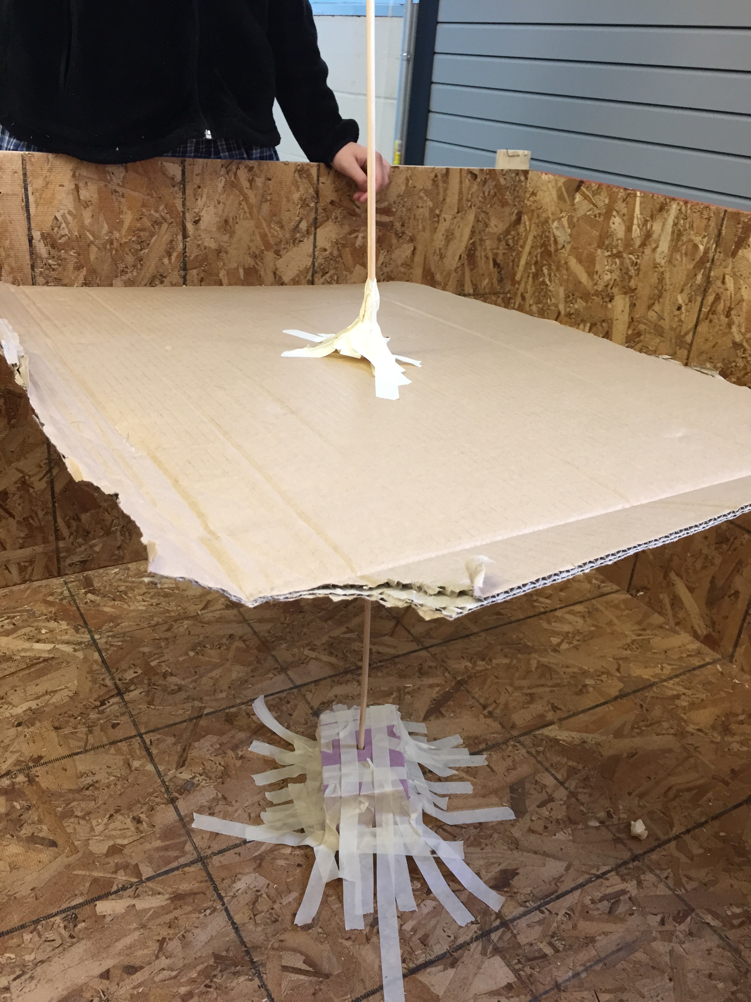 In this image to the left you can see a clear visual of how this machine will function. The wooden stick through the middle of the cardboard is the motor. The bottom section (with all the tape), is also representing a special part of the motor. The cardboard helps represent the canvas (or other material), where the design will be created.