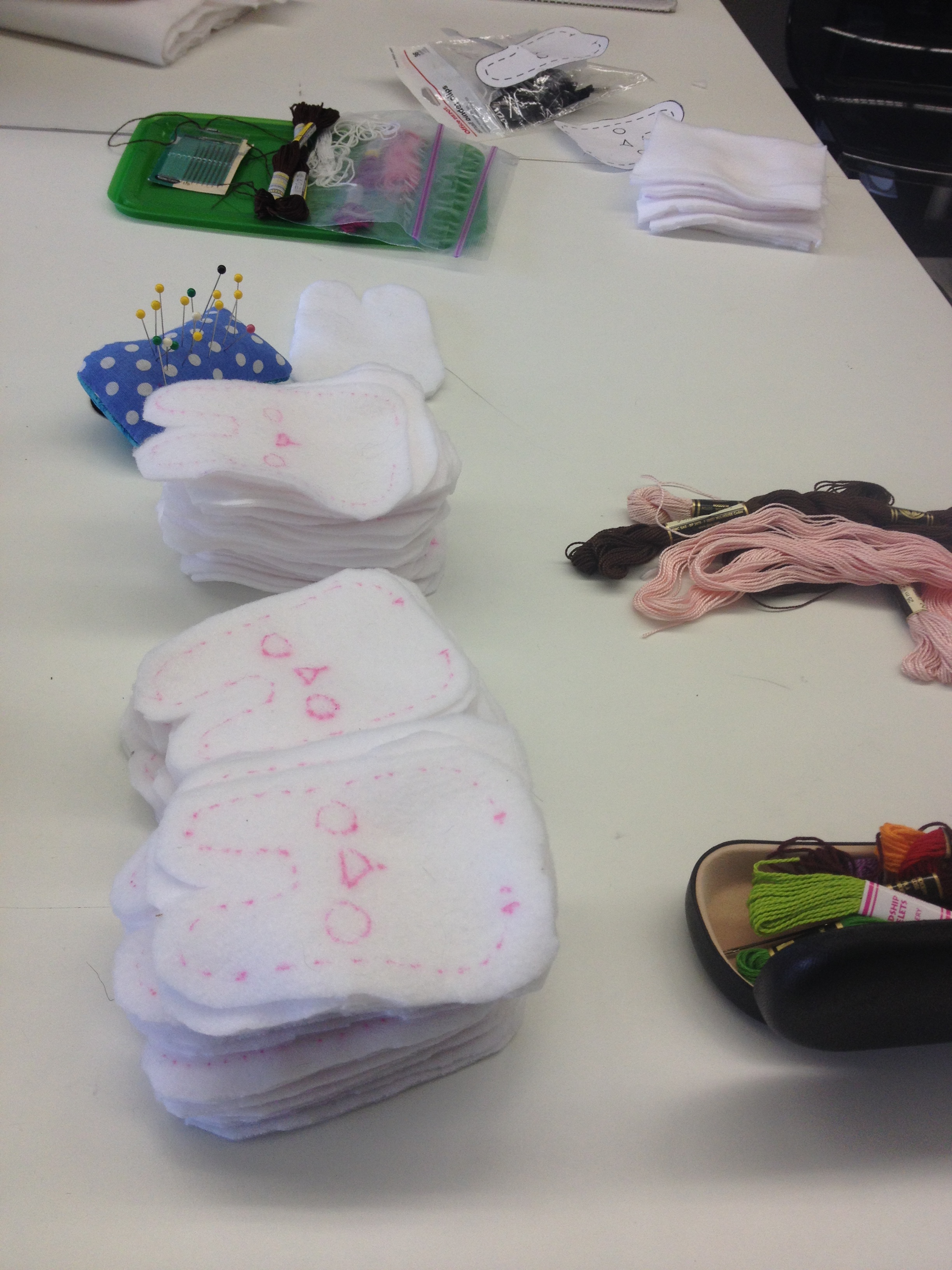 The Giving Bunny Project’s sole purpose is to create little stuffed bunnies and to give them away. Based on that information, Izzy started the next class after my application by teaching correctly how to make them. Let’s just say that at the end of that day, my hands were coated with pen. To make a bunny, you first need to trace the outline of the bunny, then embroider it’s little face, after that we sow the bunny together with the very complicated “backstitch”, then we would flip it inside out, sew on it’s pom-pom tail and finally stuff them (with the final addition of closing it up). I wouldn’t really say that its a complicated process but making the bunnies takes