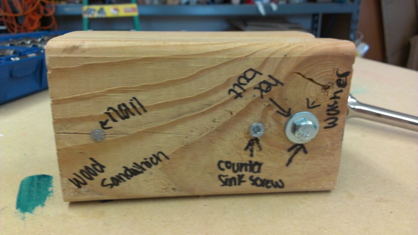 I think that the Construction and Fabrication Basics module that I did changed that, for this module we were building something, and I love building things, even though I don’t see me doing anything that deals with engineering in the future, and building is a part of what engineering is. For the first part of the challenge, that you do independently, was to put two pieces of wood together with different types of screws, and you had to put the screws and nails in with hammers and screw drive. I really enjoyed that, and finding different ways to put the screws and nails in, which was entitled ‘Wood Sandwich’
